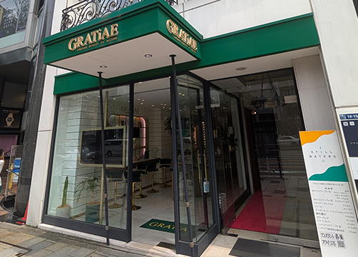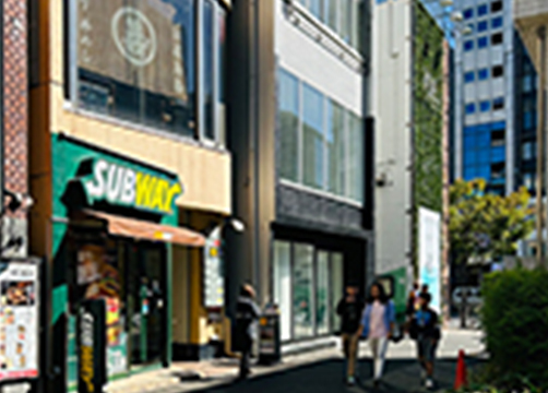 そちらの左隣のビルが「キミジマビル」となりますので、赤い絨毯の敷いてある入り口から奥に進んでいただき、エレベーターで4階までお越しください。