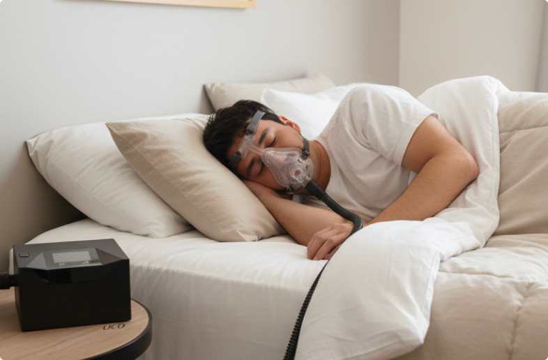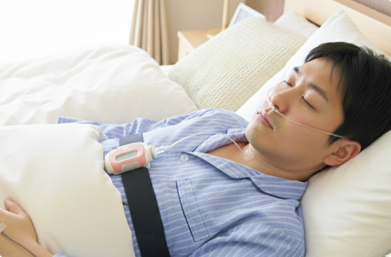 当院では、睡眠中の呼吸やいびき、血中の酸素濃度、脈拍の変化などを記録し、眠りの状態を客観的に調べる検査を行っています。