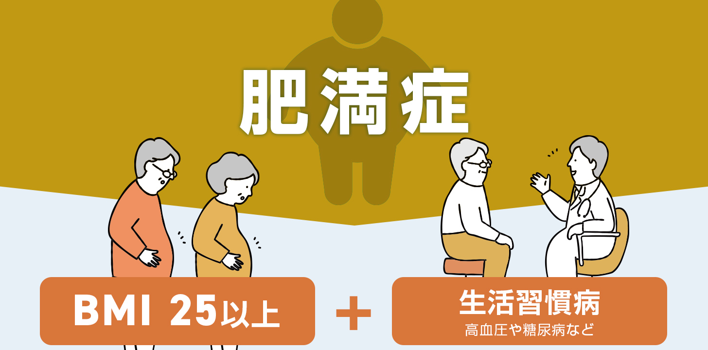 日本肥満学会のガイドラインにおける定義では、BMIが25以上であり、かつ肥満に起因または関連する健康障害(高血圧、脂質異常症、2型糖尿病、睡眠時無呼吸症候群、脂肪肝、変形性膝関節症など)を1つ以上有する場合に「肥満症」と診断されます。